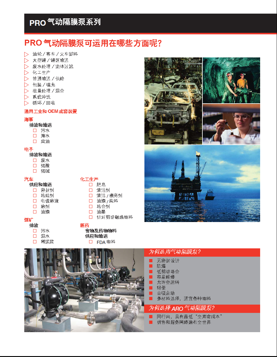 ARO英格索蘭隔閡泵首要的上風在于氣動隔閡泵的關頭部件---氣動馬達,它具備多項專業手藝,不死點,無失速馬達,D型閥布局等等,這些專業保障了 ARO氣動隔閡泵在馬達手藝上處于搶先的位置。它具備專業設想的氣閥防侵蝕的配件,及其他設想的長處。使ARO氣動隔閡泵具備不超溫,無功率消耗,可 處置懸浮物及可簡略單純地調劑傳遞等長處。ARO隔閡泵可保送各類黏度液體,合用于各行業的送料,比方涂裝,排污,廢物處置...... 等等。